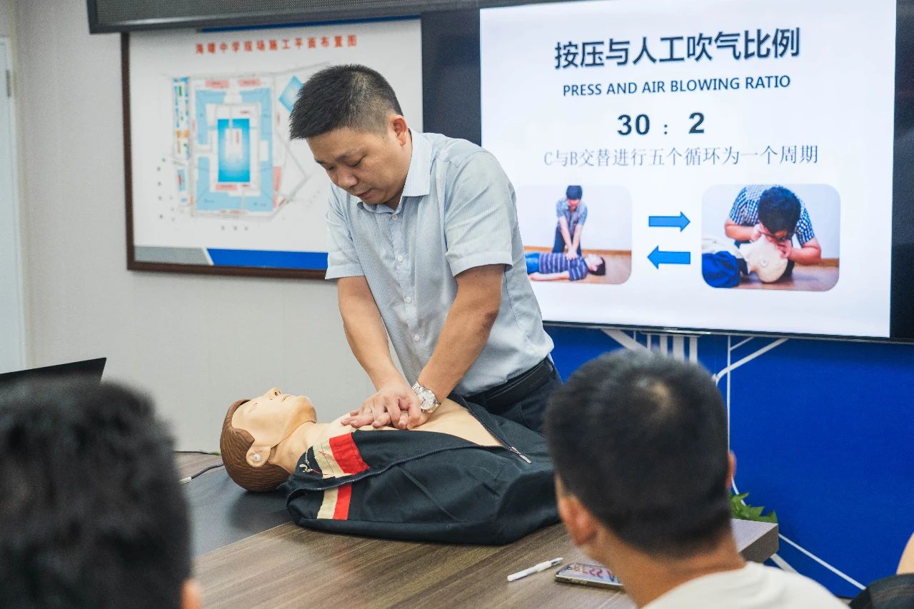 我司承建的海曙中學(xué)項目部臨時黨組織書記許婕在了解到項目部的工友們都希望學(xué)習(xí)急救知識,提高突發(fā)事件的應(yīng)急處置能力后,9月4日晚上,在海曙中學(xué)項目部舉辦了一場培訓(xùn)+實操+競賽的主題活動,開啟工地賦能新篇章。